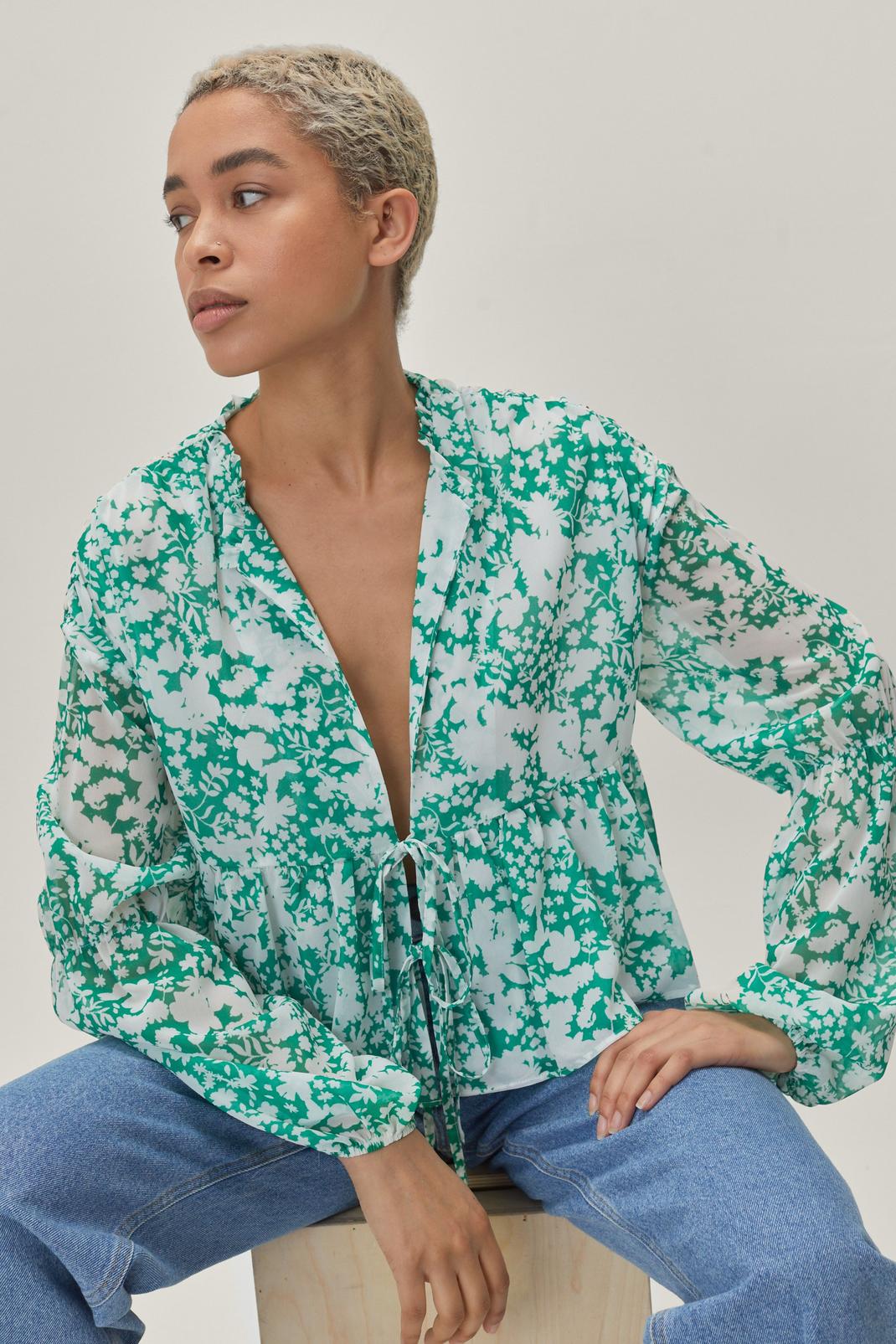 130 Floral Tie Front Cropped Smock Blouse image number 0