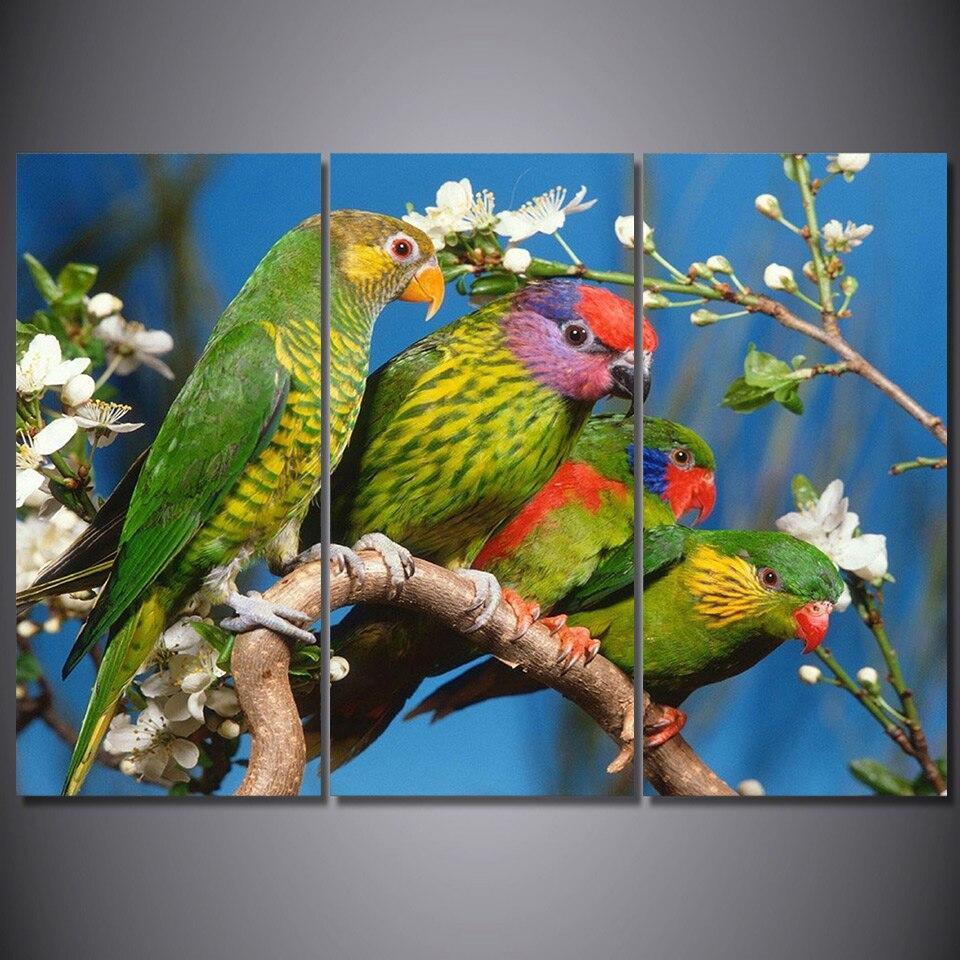 3 Panel Canvas Art Green Parrots On The Tree Wall Pictures for Living Room WITH FRAME HQ Canvas Print