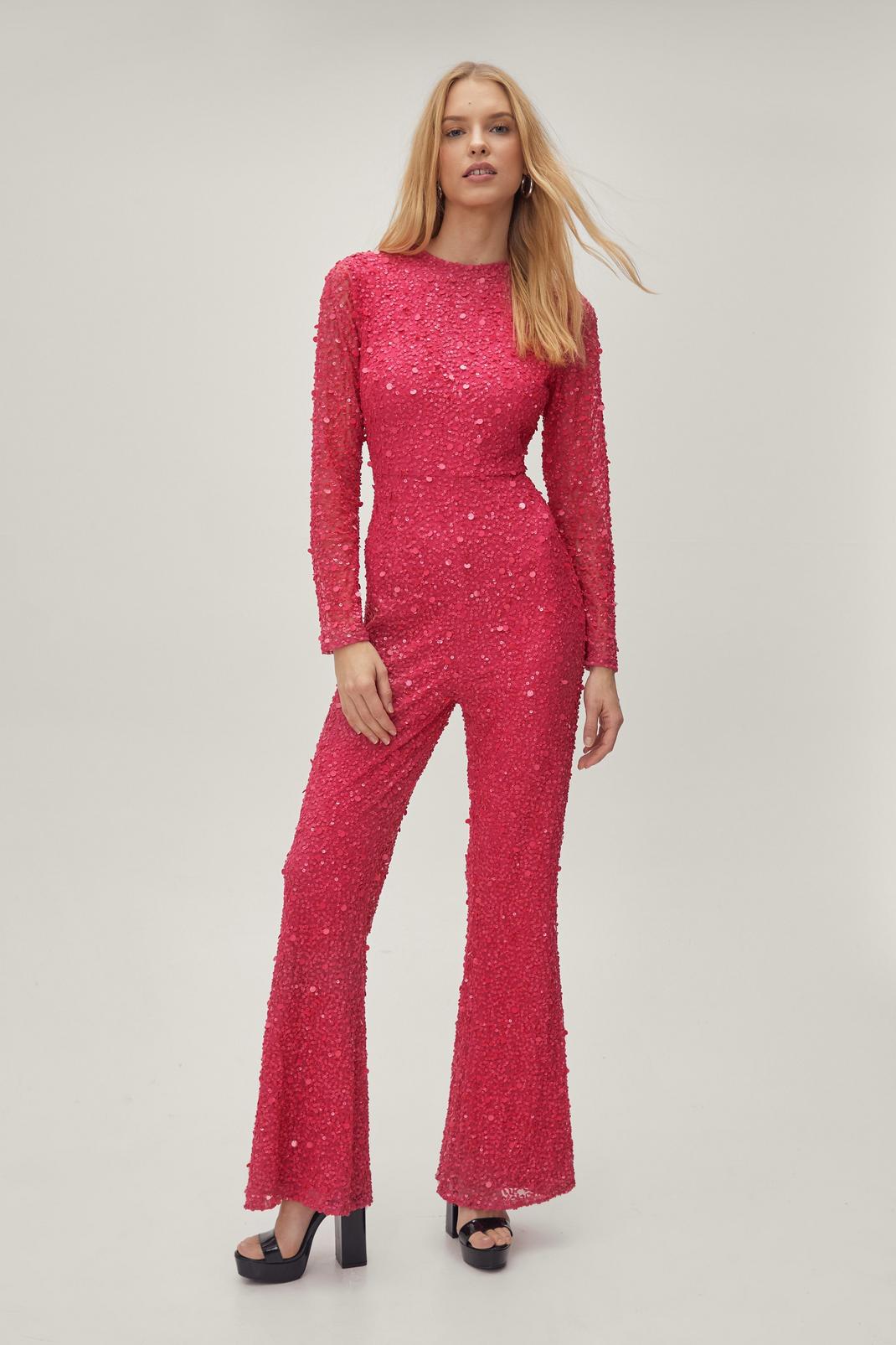 658 Beaded Long Sleeve Flared Leg Jumpsuit