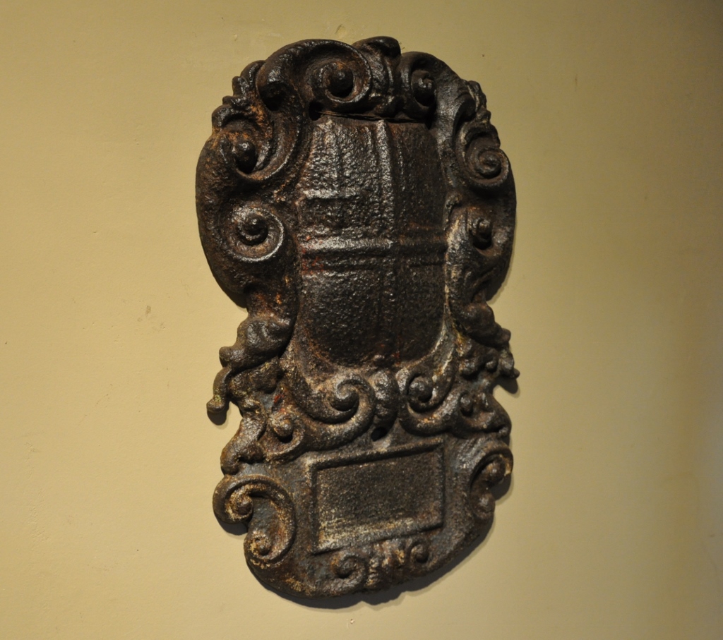 A LATE 17TH CENTURY ENGLISH CAST IRON COAT OF ARMS WALL PLAQUE.
