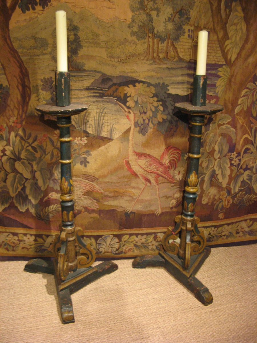 A PAIR OF 17TH CENTURY ITALIAN POLYCHROMED STANDING CANDLESTICKS WITH TRIFORM BASES. C1680.