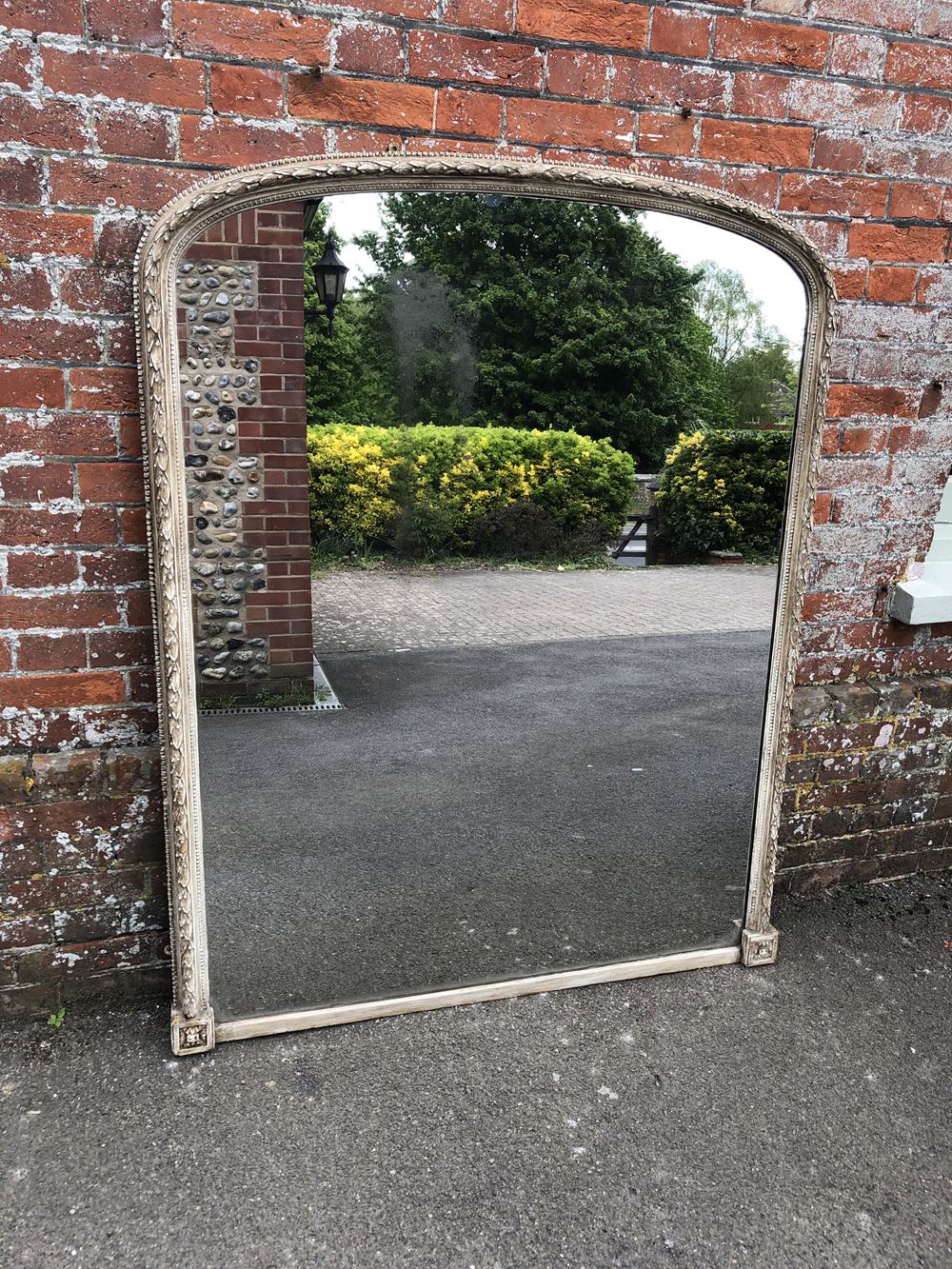 A Stunning large Antique English 19th Century carved wood & gesso laurel leaf framed arched top painted Mirror.