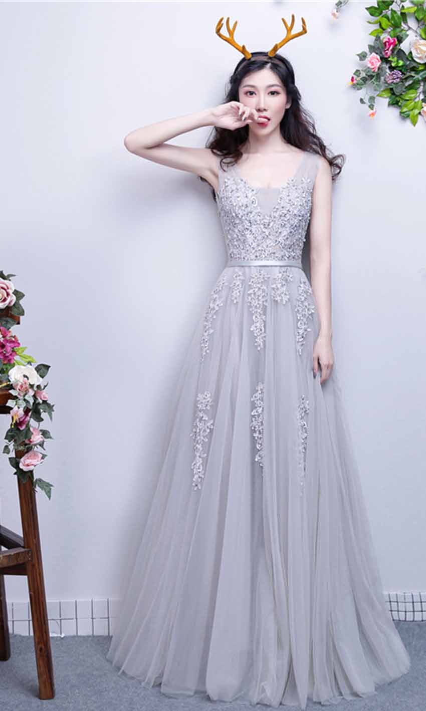Applique Lace V-neck Long Grey Prom Gowns with Straps KSP451 - £102.00