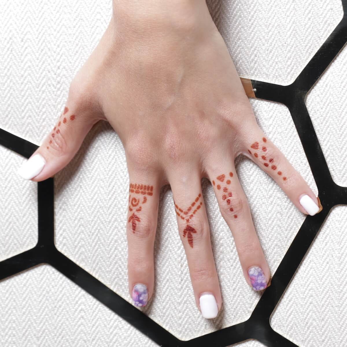 Aria - close up of finger henna tattoos