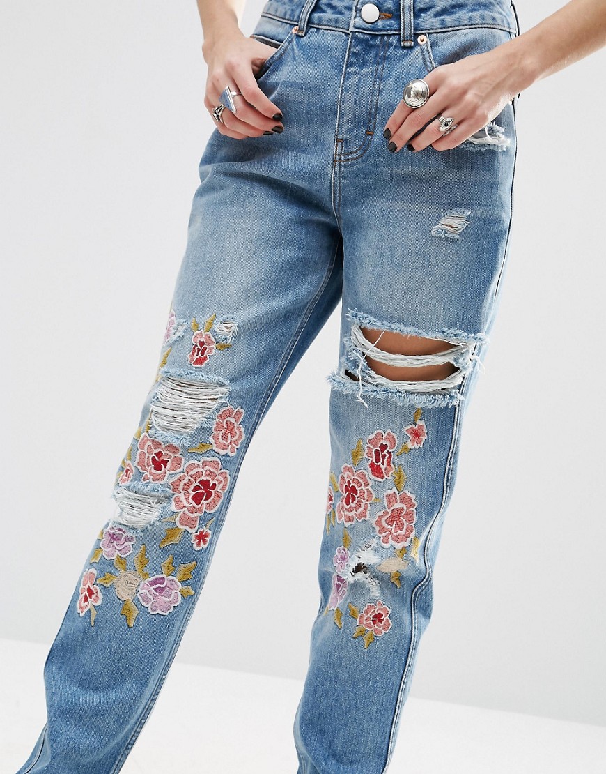 ASOS Original Mom Jeans in Mid Stonewash with Floral Embroidery and Rips