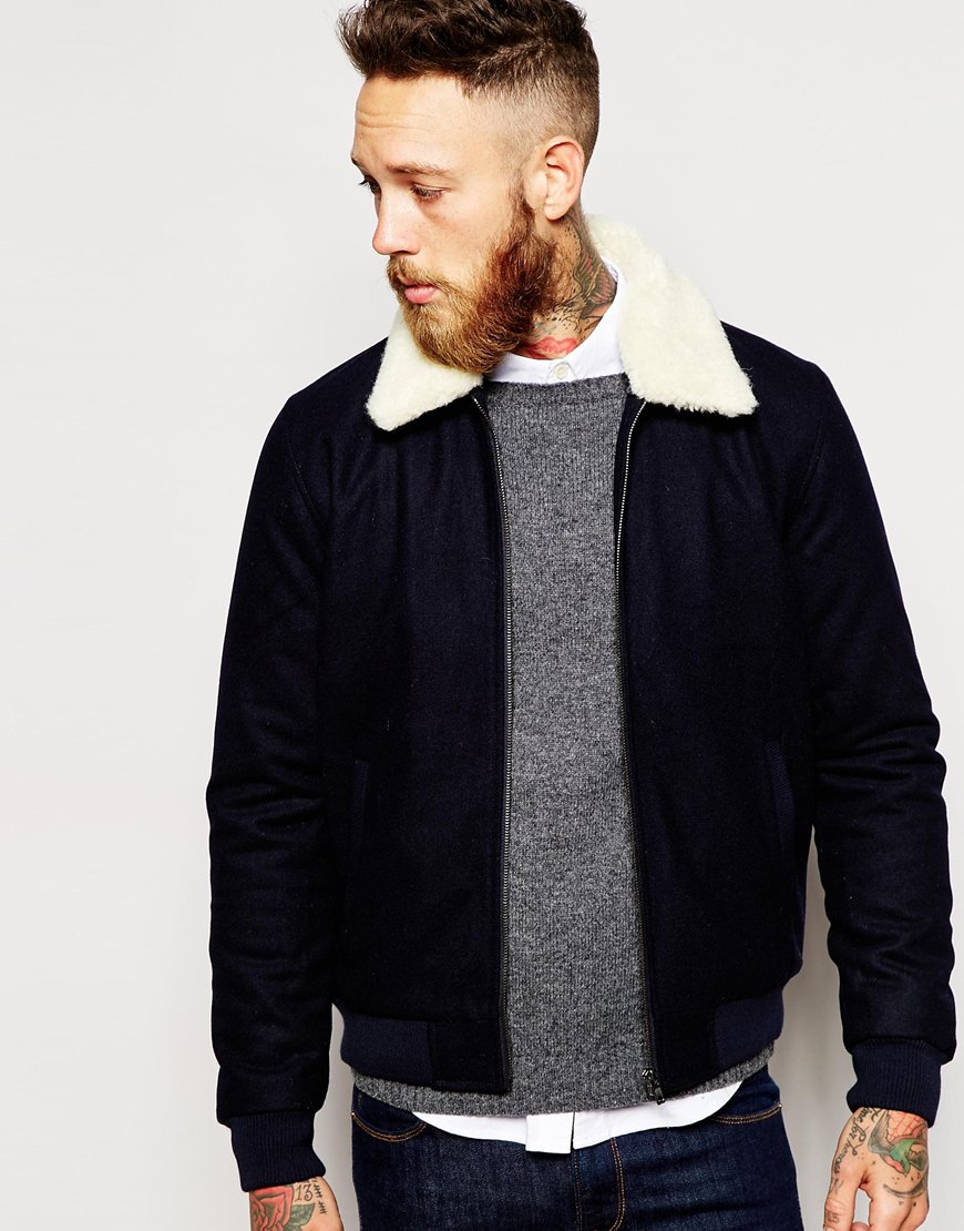 ASOS Wool Harrington Jacket With Faux Shearling Collar In Navy