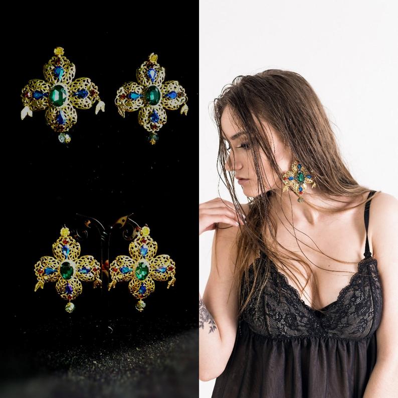 Baroque Cross Dolce Earrings Chandelier Gold Earrings Large Corss Swarovski Earrings Green Blue Red Womens Gift Byzantine Earrings Dangle