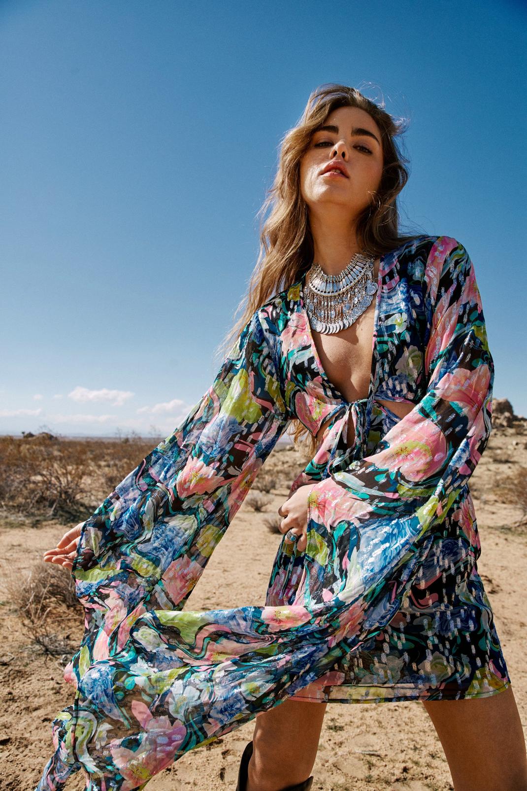 Blue Floral Metallic Flare Sleeve Mini Dress image number 1