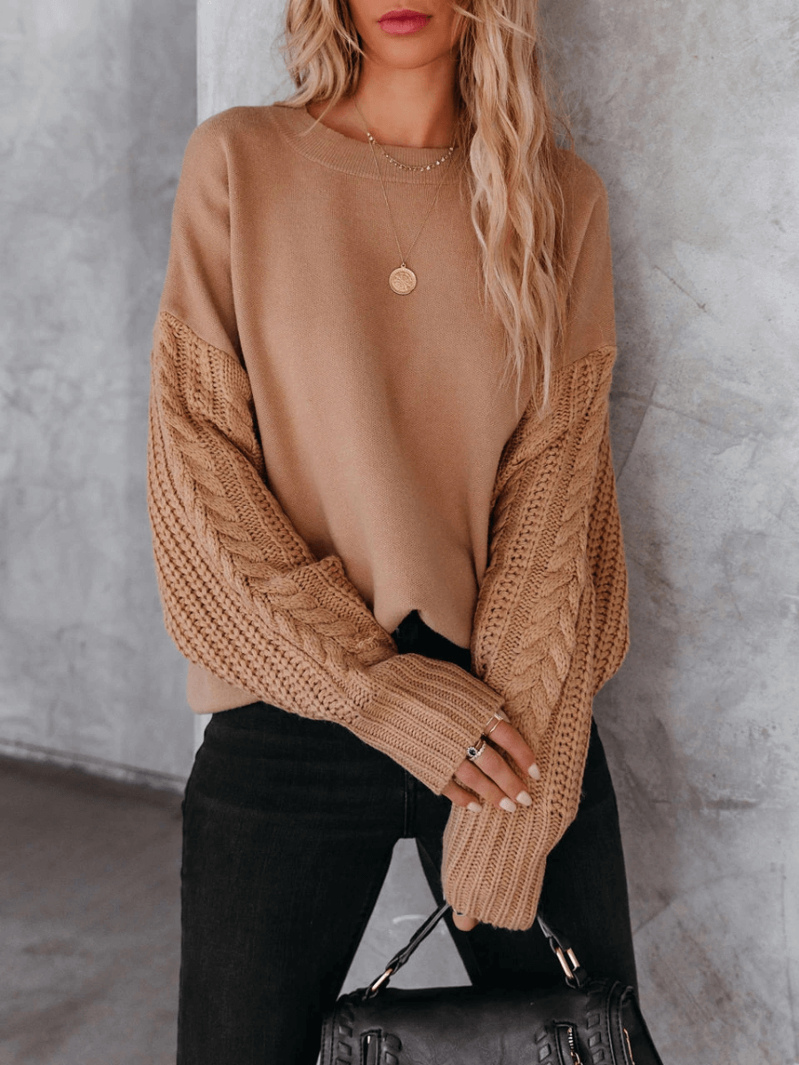 BRAIDED SLEEVE KNIT SWEATER - KHAKI