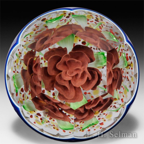 Caithness Glass 2014 'Chocolate Surprise' red rose with blue and white double overlay faceted paperweight, by Scott Sinclair. by Caithness Glass Inc