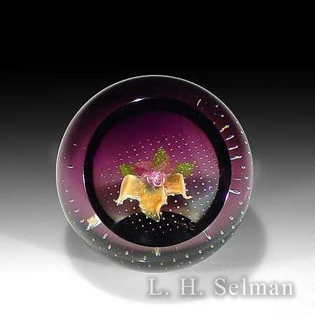 Caithness mauve & goldenrod orchid paperweight on lavender by Caithness Glass Inc