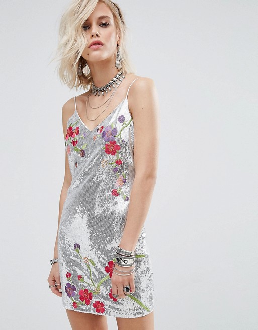 Cami Slip Dress In Metallic Silver With Floral Embroidery