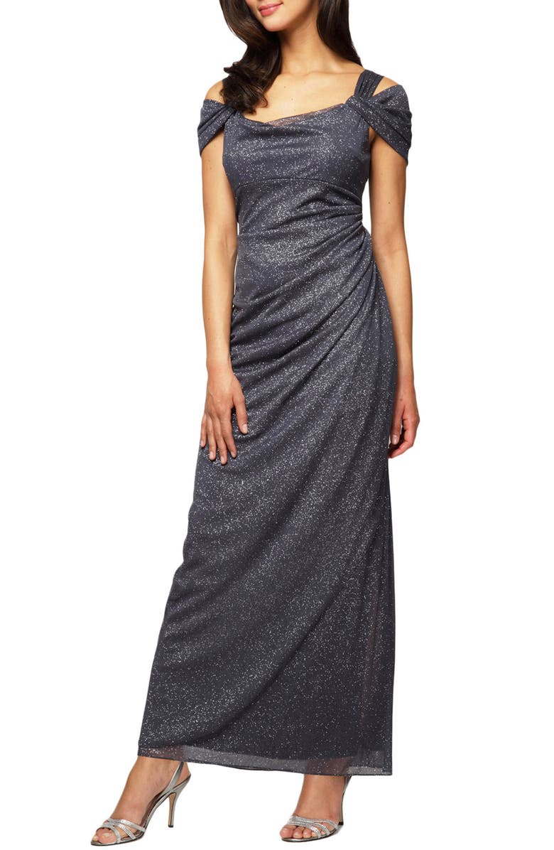 Cold Shoulder Ruffle Glitter Gown, Main, color, SMOKE