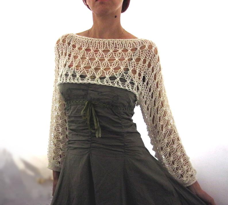 Cotton Summer Cropped Sweater Shrug in Ivory color, hand knitted, ecofriendly, Loose knit cropped sweater