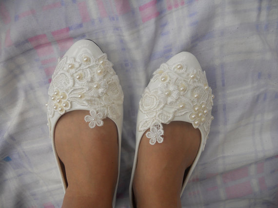 Custom Women Wedding Shoes White Lace Ivory Pearls Bridesmaids Shoes Lace Party Shoes