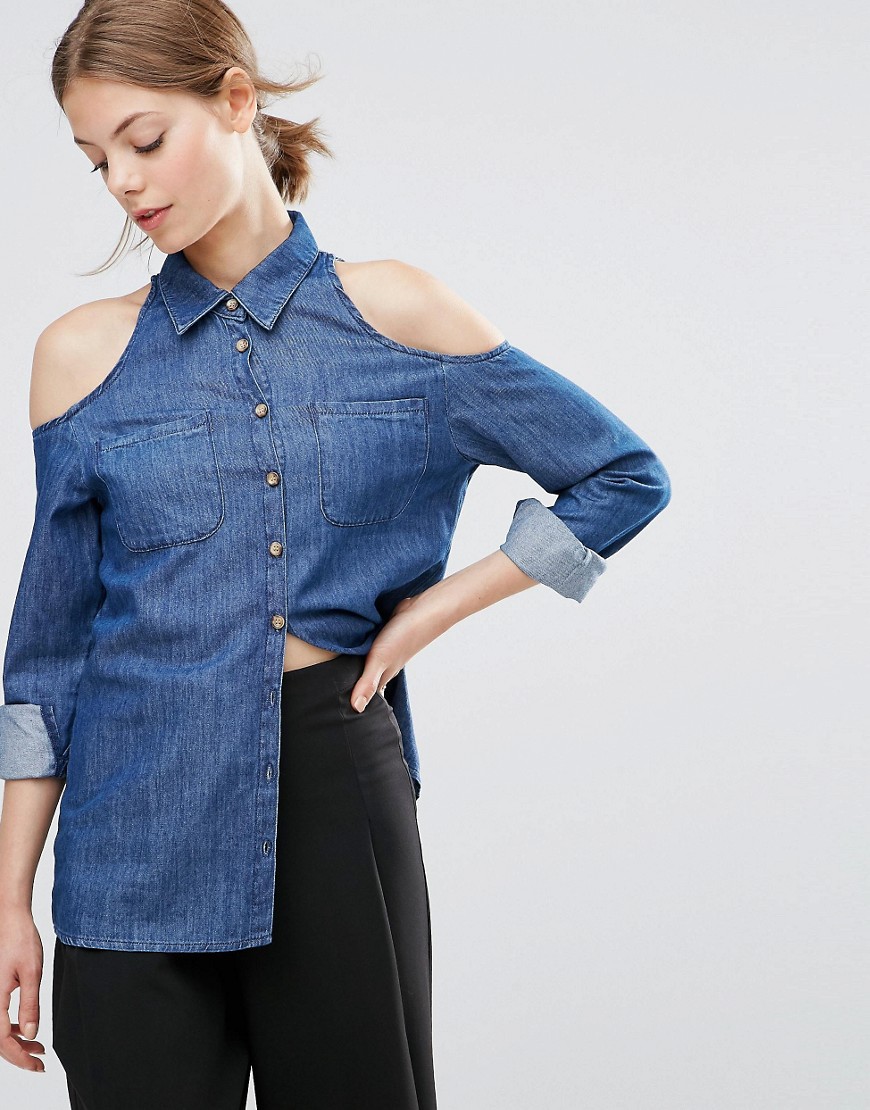 Denim Cold Shoulder Shirt in Dark Wash Blue