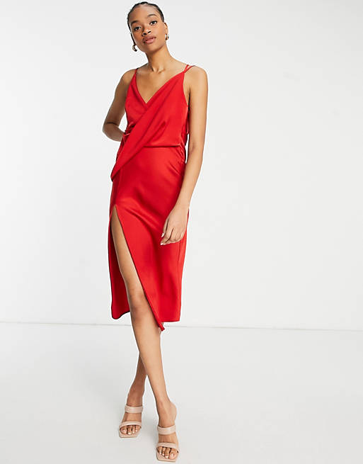 drape front midi slip dress with wrap skirt in red, 1 of 4