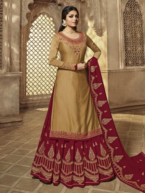 Drashti Dhami Mustard Satin Georgette Lehenga Style Suit