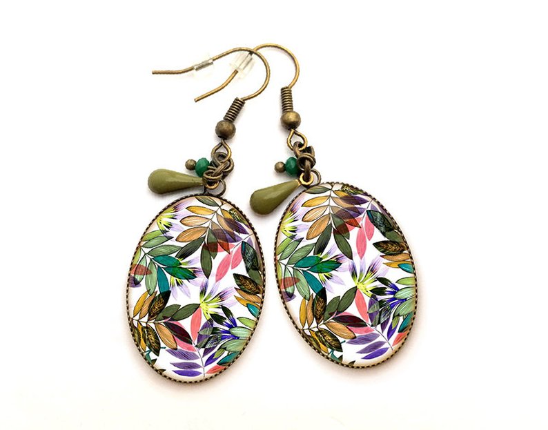 Earrings pendant women cabochon jungle leaf, green, purple, white