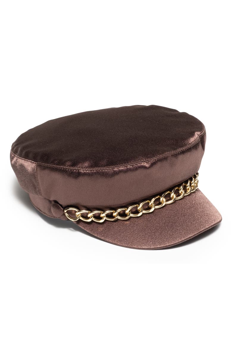 Eugenia Kim Marina Chain Trim Satin Cap, Main, color, Chocolate
