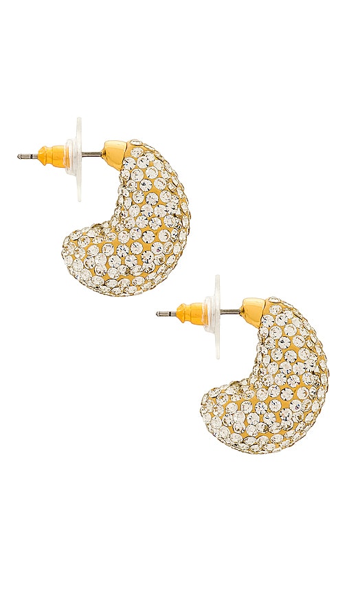 Female Model wearing Lele Sadoughi Pave Dome Mini Hoop Earrings Jewelry.