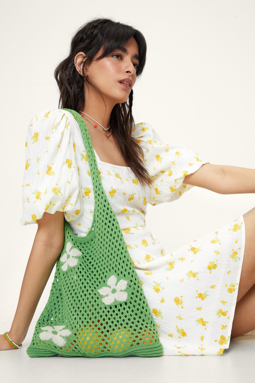 Green Floral Crochet Tote Bag