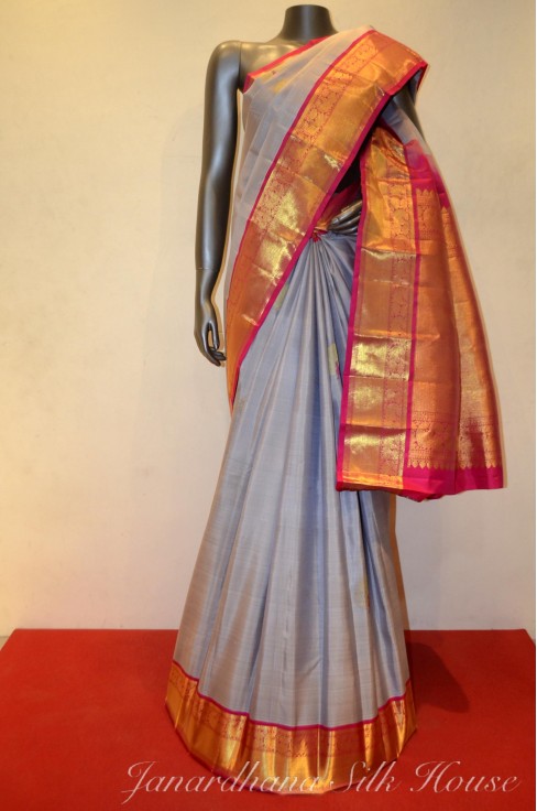 Grey Classic Bridal Kanjeevaram Silk Saree With Traditional Grand Zari Border