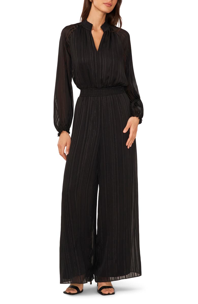 Halogen® Metallic Smocked Waist Long Sleeve Jumpsuit, Main, color, RICH BLACK