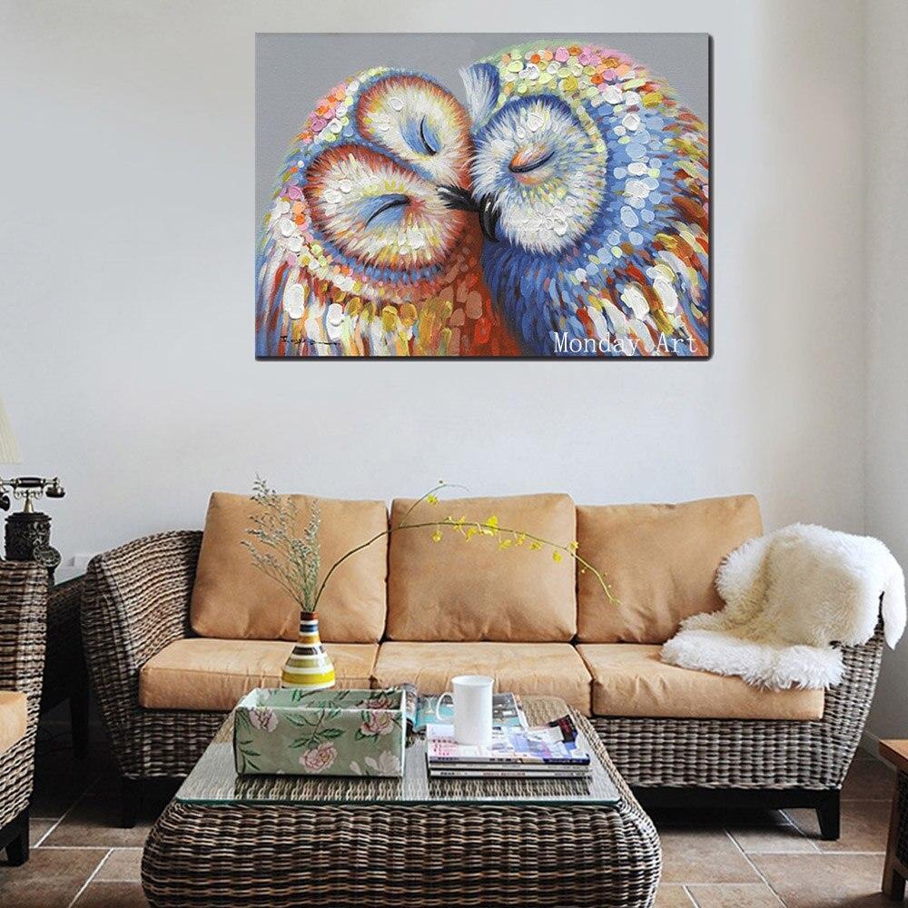 Hand Painted Kissed Owls Couple Canvas Hang Wall Art Owl oil Painting animal painting for child's room decor