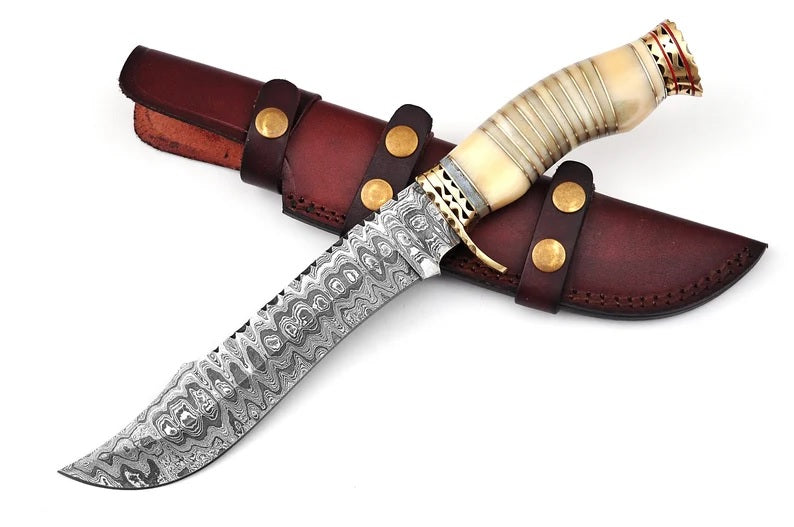 Premium Modern Bowie Knife - Damascus Steel Blade with Handmade Bone Handle and Brass Guard