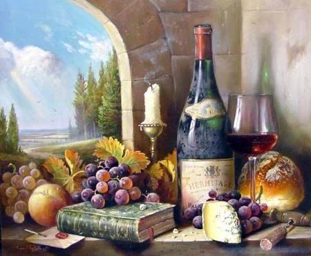 Handmade Oil Painting Glass of Red Wine with Grapes, Books and Peach Blue Sky Green Trees (hand painted)