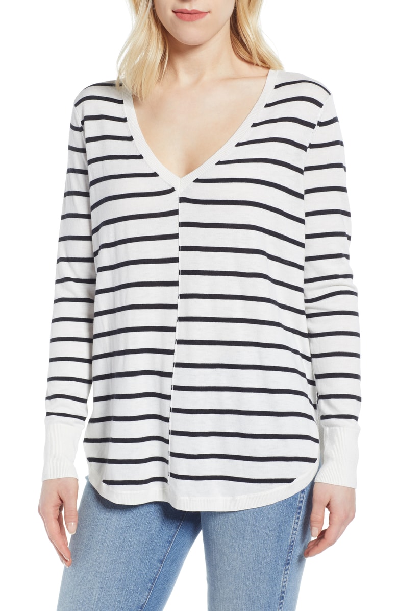 ® High-Low V-neck Sweater, Main, color, IVORY- BLACK PRITHI STRIPE
