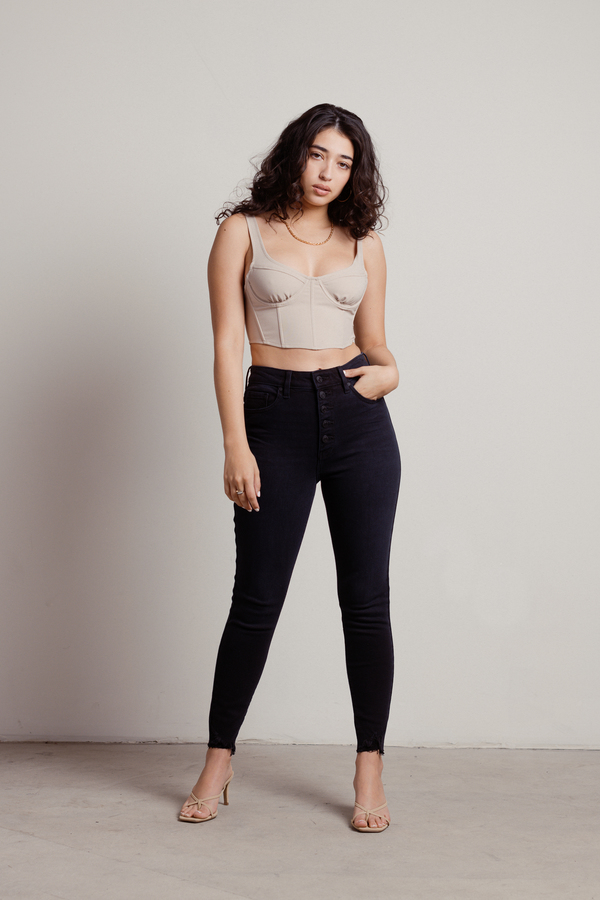 High Rise Exposed Buttons Skinny Crop Jeans in Black