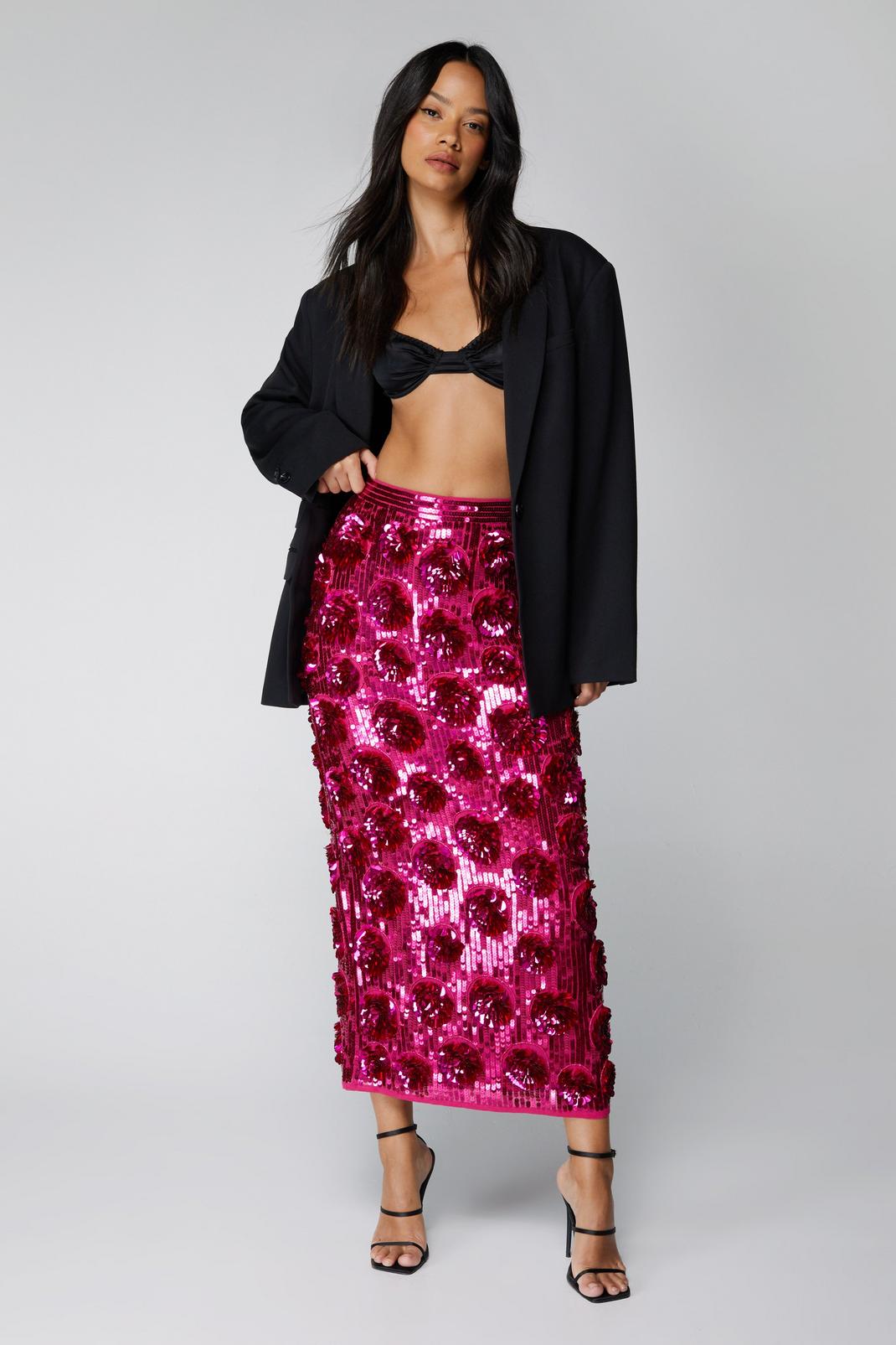 Hot pink 3D Sequin Floral Midi Skirt image number 1