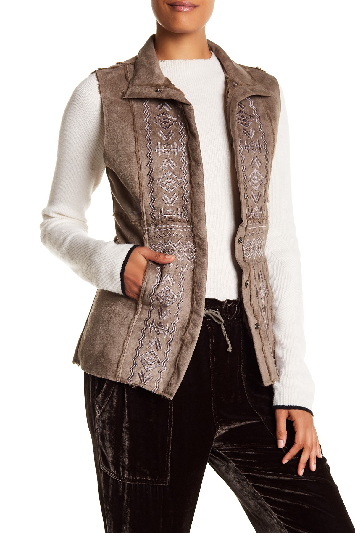 Image of Johnny Was Embroidered Faux Fur Lined Faux Suede Vest