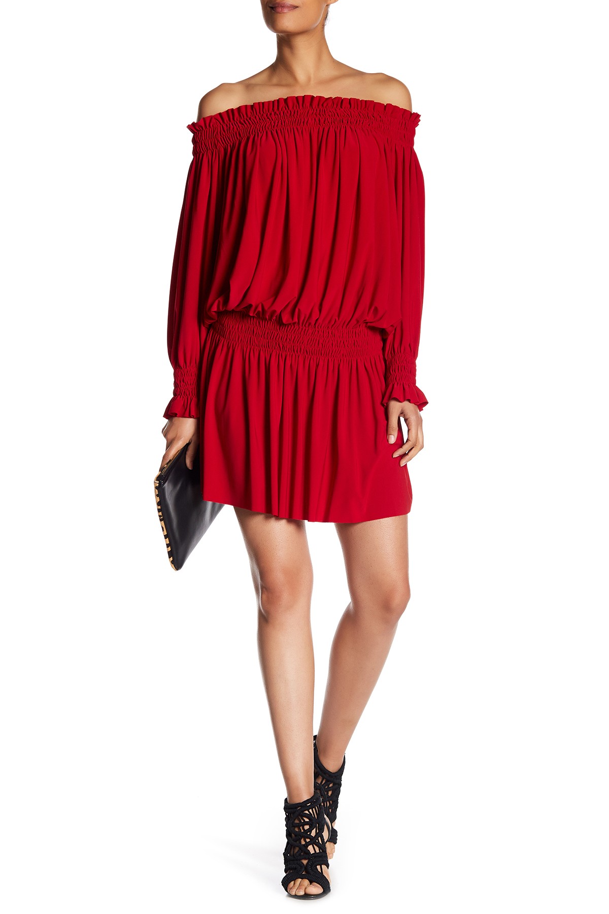 Image of Norma Kamali Smocked Off-the-Shoulder Long Sleeve Solid Dress