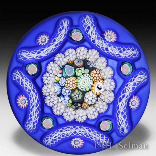 John Deacons 2014 opaque blue overlay with close packed millefiori porthole paperweight. by John Deacons