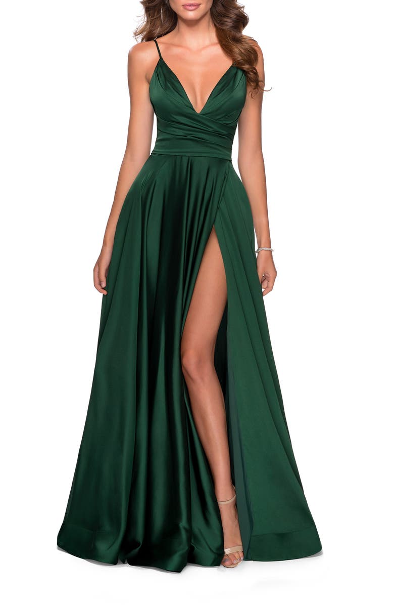 LA FEMME Strappy Back Satin Ballgown, Main, color, EMERALD