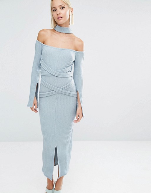 Lavish Alice Rib Knit High Neck Wrap Around Belt Midi Dress