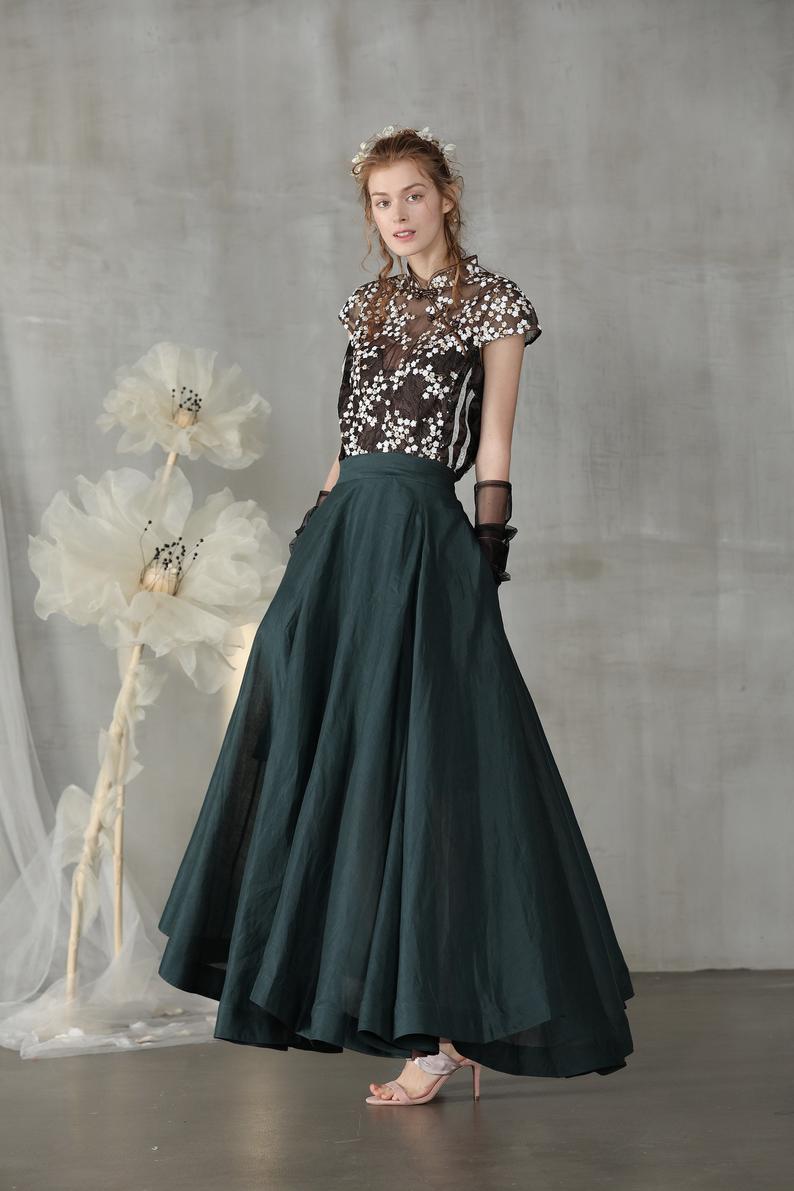 Linennaive linen skirt in teal green, maxi skirt, high waist skirt, full length skirt, long skirt, flared skirt, skater skirt | Linennaive®