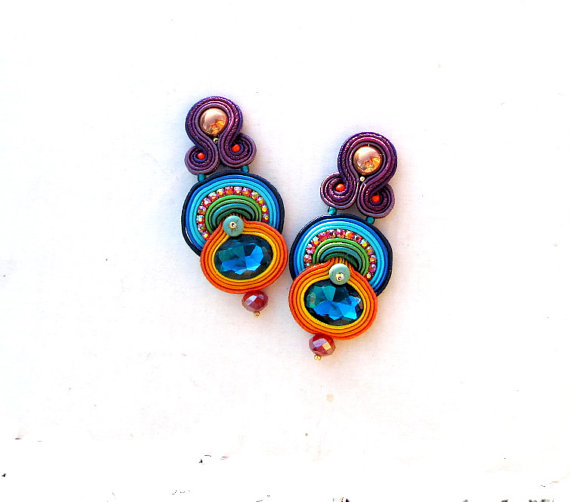 Long Clip - On Earrings - Unique Handmade Soutache Earrings - Long Clip on Earrings with Crystals - Hand Embroidered Soutache Earrings