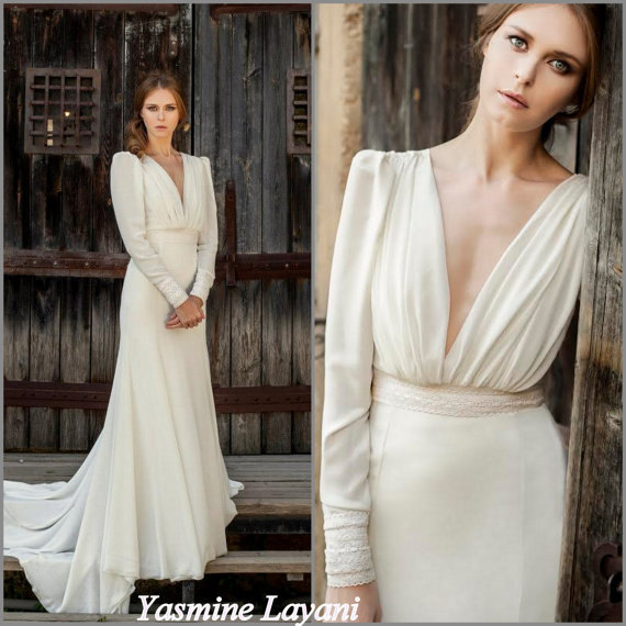 Long Sleeve Wedding Dress Chiffon Wedding gown Boho Chic Bridal Dress Romantic Bridal Gown elegant vintage style custom designed gown