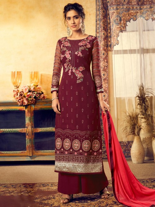 Maroon Viscose Georgette Partywear Palazzo Suit