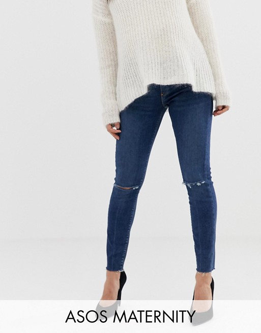 Maternity Ridley high waisted skinny jeans in dark wash blue with ripped knee detail with under the bump wai