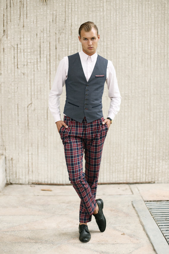Mens checkered wool PANTS Mens tailored trousers Trousers with pleats Pleated plaid pants Mens clothing Navy red Designer pants