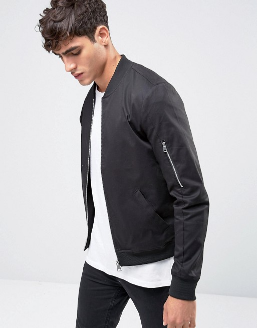 Muscle Fit Bomber Jacket With Sleeve Zip in Black