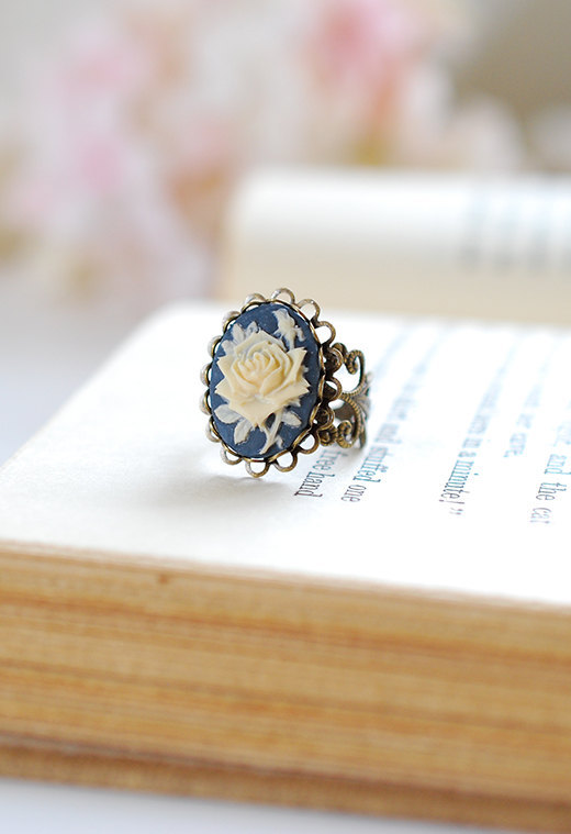 Navy Blue Ivory Rose Cameo Ring, Victorian Style Antique Brass Filigree Adjustable Ring, Cocktail Ring.