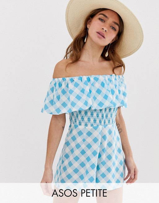 Petite off shoulder ruffle romper with shirring in gingham print