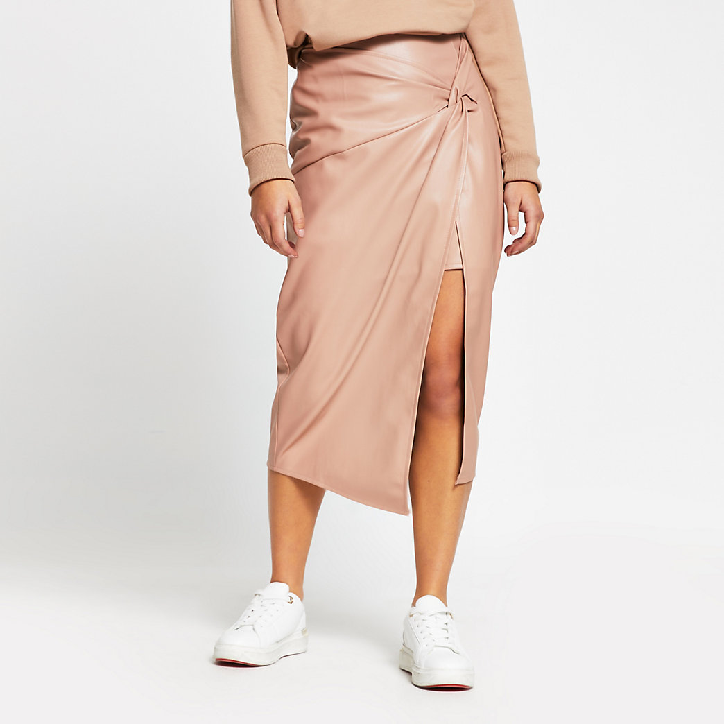 Pink Faux Leather Wrap Midi Skirt