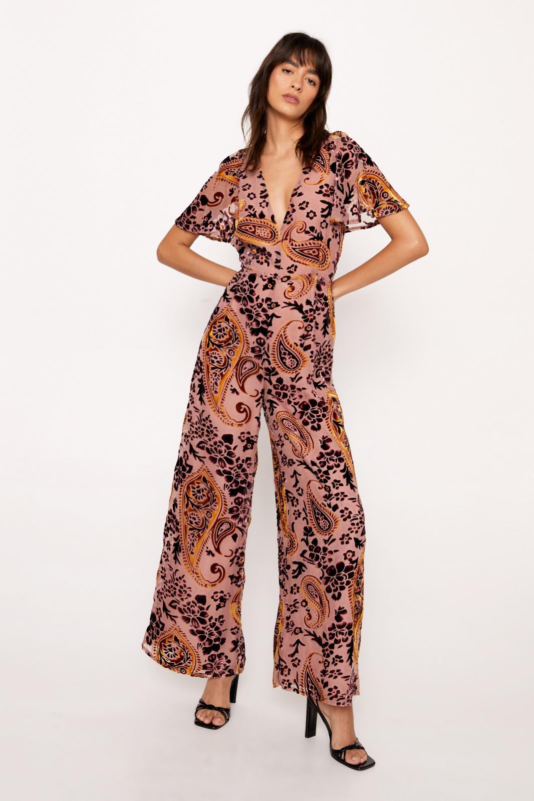 Pink Paisley Devore Angel Sleeve Jumpsuit